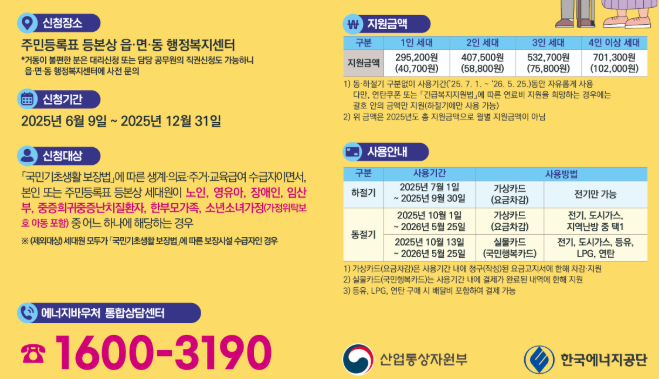 - ☎ 에너지바우처 통합 상담센터: 1600‑3190 (평일 9~18시)
