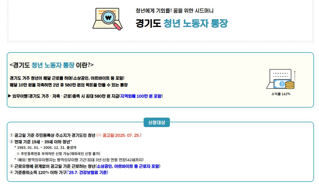 ✔ 청년이 매달 10만 원 저축 → 경기도가 14만 2천 원을 추가 지원