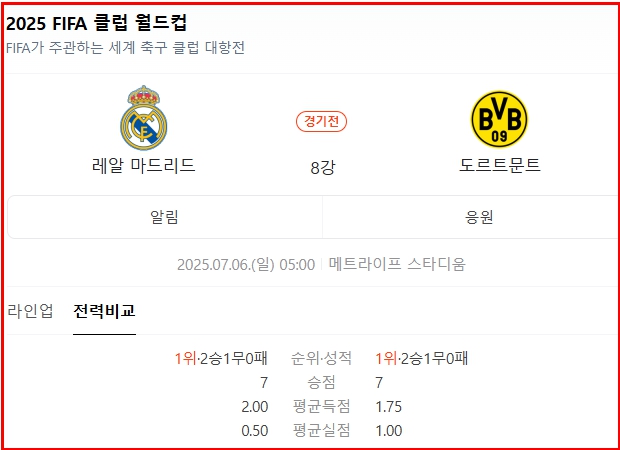 레알 마드리드와 도르트문트가 2025 클럽월드컵 8강전에서 운명을 건 빅매치를 펼칩니다.