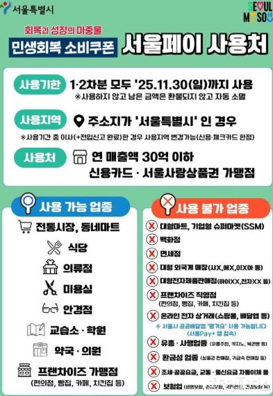 | 사용처 | 전통시장, 동네마트, 식당, 약국, 학원, 미용실 등 | 대형마트, 백화점, 면세점, 유흥업, 사행업 등 |
