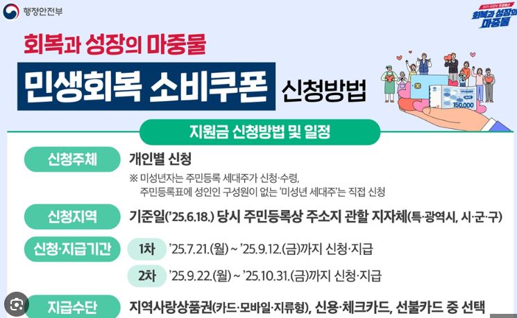 2025년 민생회복 소비쿠폰은 국민 모두를 대상으로 1차 15만 원, 2차 10만 원 등 최대 55만 원까지 받을 수 있는 소비 지원 혜택입니다. 신청 대상, 지급 일정, 사용처, 미성년자 신청 방식, 주의사항까지 꼼꼼히 정리했습니다.