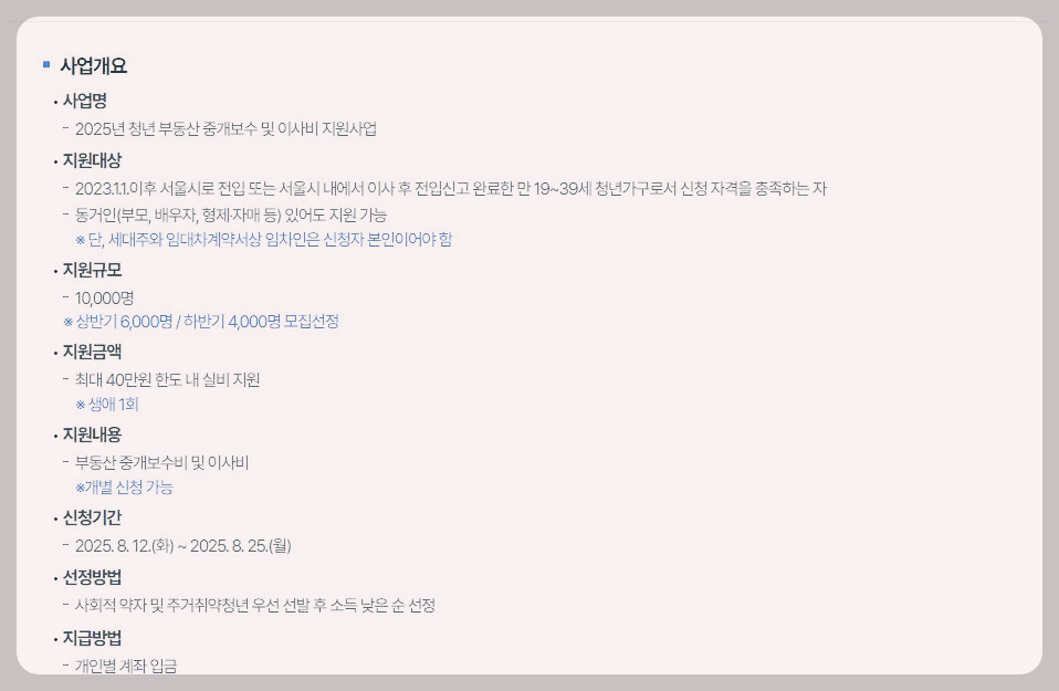 - 최대 40만 원 한도 내 실비 지원 (이사비 또는 중개보수 택 1 가능)