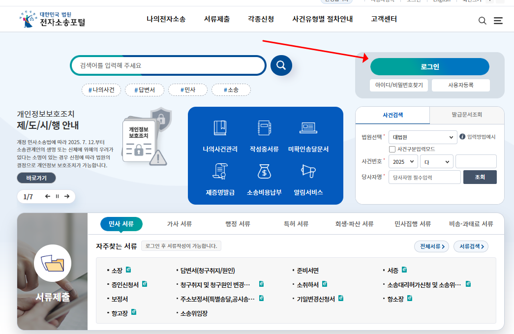전자소송 시스템 내 "사건조회" 메뉴에서 진행 상황 실시간 확인