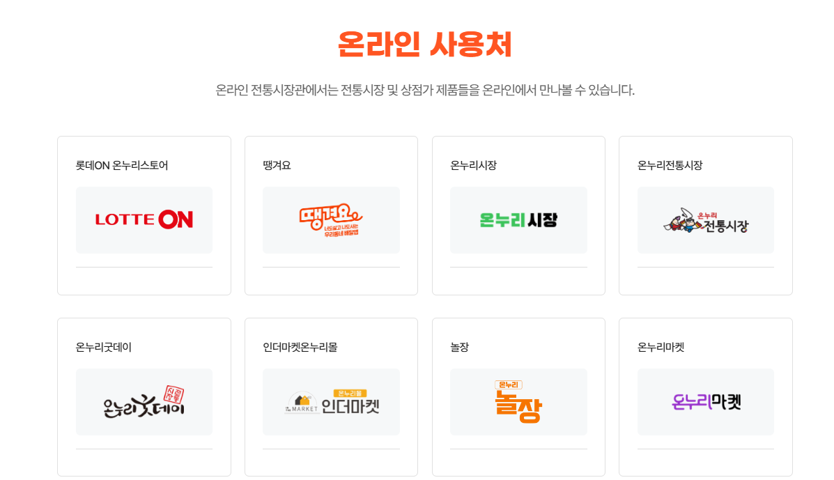 | 오프라인 | 전통시장, 골목상권, 농산물 직거래 장터, 수공예·특산품 매장, 소규모 식당·정육점 등 |