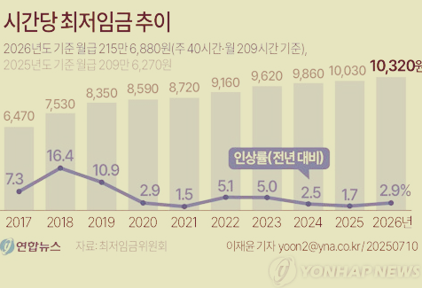 2026년 최저임금은 10,320원, 전년 대비 2.9% 인상, 월급 환산 시 215만 6,880원(주 40시간, 월 209시간 기준)입니다.